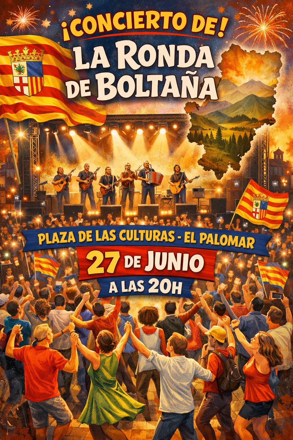 Fiesta mayor. Actuación en escenario. A las 6 de la tarde. |